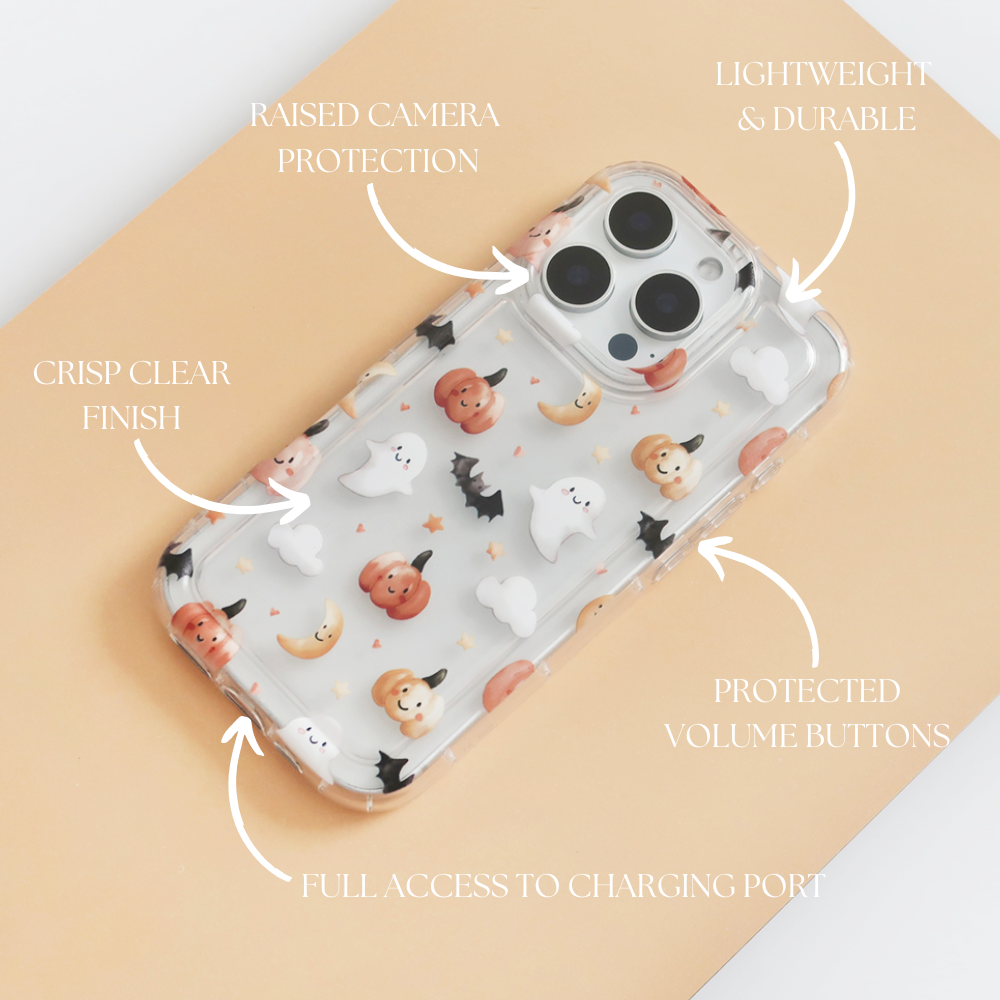 Our Clear Phone Case – Halloween Friends is sprinkled with charming little characters from pumpkins to friendly ghosts, each ready to join you for trick-or-treats, autumn strolls, and cosy nights in.